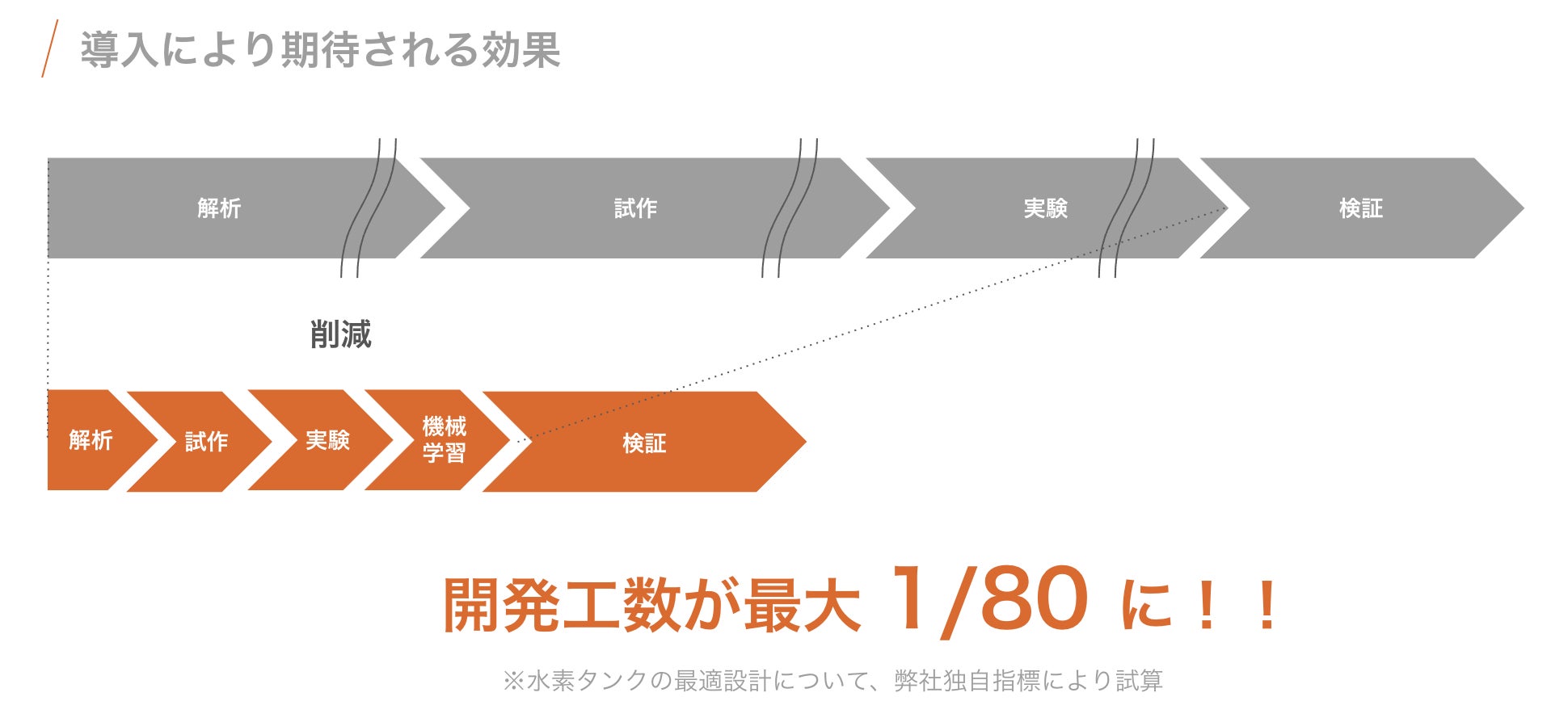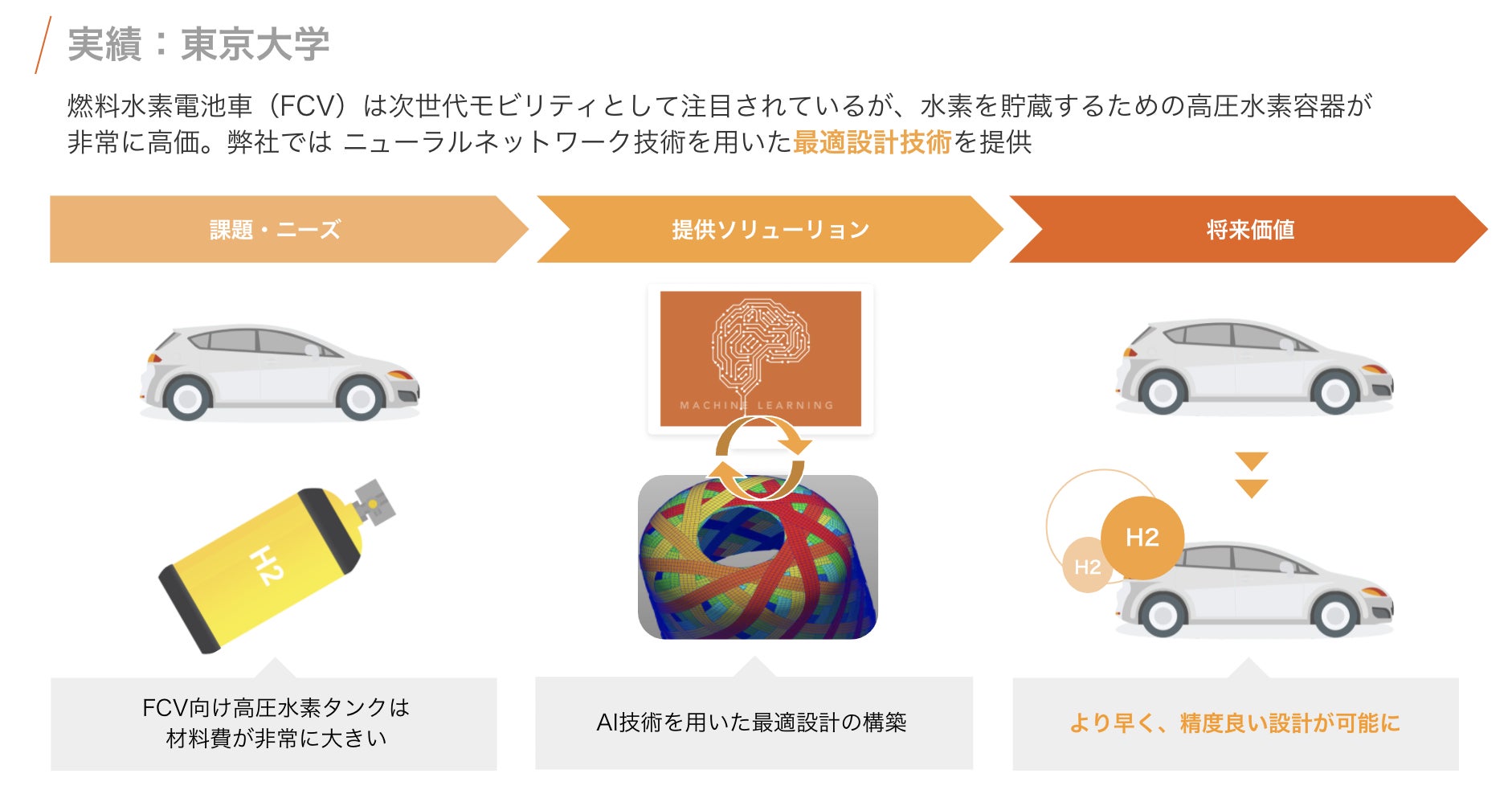 燃料水素電池車(FCV)は次世代モビリティとして注目されていますが、水素を貯蔵するための高圧水素容器は非常に高価です。そこで、機械学習・AI技術を用いた最適設計技術を東京大学と共同で開発を推進しています。機械学習の適用可能性について期待を寄せられた結果 採択され、現在プロジェクトを推進中です。
