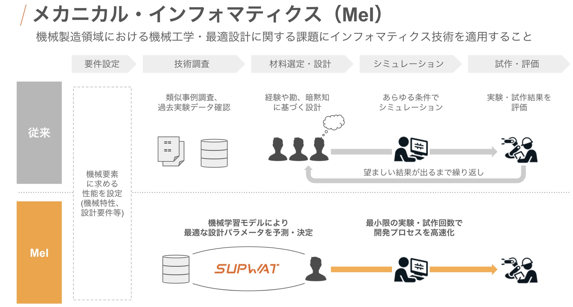 SUPWATでは、製造業への深い知見を活用しながら、製造領域に対して機械学習等の技術を適用する「メカニカル・インフォマティクス技術」で研究開発現場の課題解決に向けた事業を展開してきました。SaaS型の自社プロダクト「WALL」を提供するほか、今年度からは国家プロジェクトであるNEDO事業にも参画し、製造業における事業化を見据えた研究開発も推進しています。